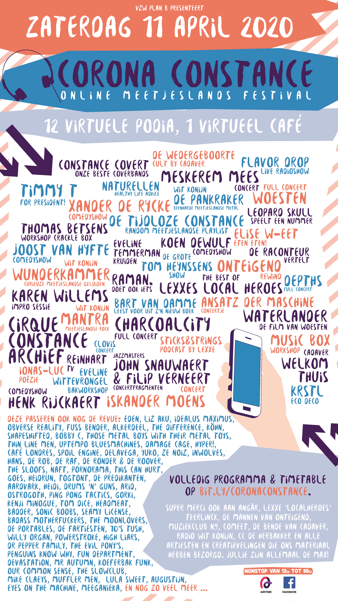 Corona Constance kan beginnen! Amper 11 dagen nadat het idee ontstond zijn we er in geslaagd om een programma samen te stellen dat werkelijk onze stoutste dromen overtreft. Ongelooflijk. Het Meetjesland leeft! En hoe?! We nemen Facebook -wat zeggen we- HET HELE INTERNET over. Toch voor één dag. :-)